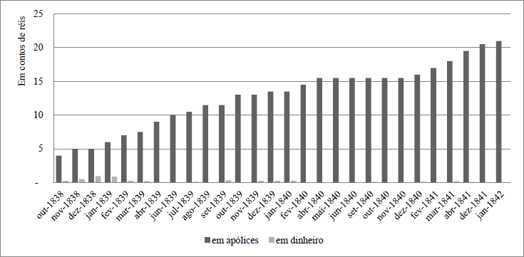 Cláudio Bastos (1997, p.35) afirma que, entre 1838 e 1858, todo o dinheiro recebido pela Caixa Particular de Ouro Preto foi aplicado nessas apólices. Embora não tenhamos a série completa dos balanços da instituição, essa informação nos parece correta a julgar pela movimentação dos balanços até 1842, que nos mostra um montante em dinheiro sempre muito baixo e um crescente saldo em apólices da dívida pública provincial, resultado das constantes compras desses títulos. Para corroborá-la, a edição de 22 de fevereiro de 1841 (p. 4) d’O Universal informa que a Caixa contava com um fundo de 16:135$400, sendo que 16:000$ em apólices e o restante em dinheiro. O Gráfico 1 mostra a composição desse fundo em que praticamente não se vê a parte em dinheiro.
