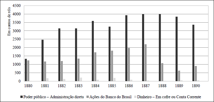 Embora a participação do poder público seja majoritária em todos os balanços, nota-se que, ao longo do tempo, há uma razoável parcela dos valores alocada em ações do Banco do Brasil. Os balanços mostram que, de junho a outubro de 1875, essas ações corresponderam, em média, a 47% do total dos fundos11. Na década de 1880, a média foi de 30%, sendo a mínima de 13% em 1889 e a máxima de 48,1% em 1880.