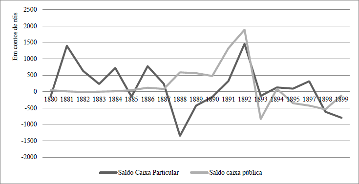 Em 1885, a Caixa Particular apresentou saldo negativo, no entanto, sem representar uma mudança no desenvolvimento da caixa pública, que seguiu constante até que ocorresse uma significativa inversão do fluxo entre 1888 e 1891. Nesse intervalo, enquanto na caixa pública o saldo acumulado montou a 2.951:623$412, na Caixa Particular o resultado foi negativo em 1.619:121$794, e, embora seu saldo anual tenha começado a se recuperar em 1891, o acumulado desde 1888 voltou a ser positivo somente em 1897.