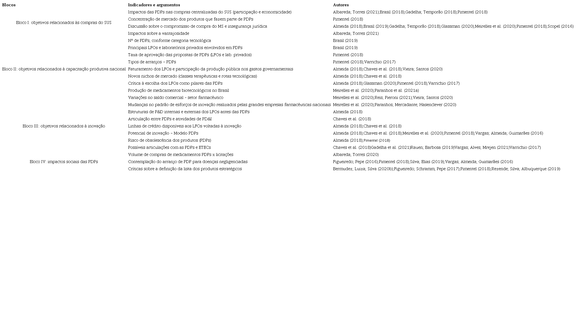 Para a construção da seção que trata dos resultados encontrados, bem como as avaliações pertinentes às potencialidades e limitações das PDPs, os objetivos explícitos da política, apresentados pela Portaria do Ministério da Saúde (MS) n. 2.531 de 2014 (atualmente integralmente incorporada pela Portaria de Consolidação n. 5, de 28 de setembro de 2017), que regulamenta a política, foram separados em quatro blocos, de acordo com a proposta de Pimentel (2018): o primeiro abrange os objetivos que fazem referência a questões relacionadas às compras do SUS, no qual o autor enquadra os conceitos de “racionalização do poder de compra do Estado”, a “centralização seletiva”, o foco em “produtos estratégicos para o SUS”, a “economicidade e vantajosidade”, os “interesses da administração” e a “sustentabilidade do SUS”. O segundo refere-se aos objetivos voltados às condições da produção local, como expressam os conceitos de “competitividade”, “produção no país”, “fabricação em território nacional”, “desenvolvimento da rede de produção pública”, “promoção de condições estruturais para aumentar a capacidade produtiva e de inovação do país”, “desenvolvimento do CEIS” e “redução do déficit comercial”. Já o terceiro bloco é composto pelos objetivos que se relacionam aos processos de inovação, em que se enquadram os conceitos de “desenvolvimento tecnológico”, “intercâmbio de conhecimentos”, “capacitação” e “inovação”. O quarto bloco contém os objetivos relacionados aos impactos sociais esperados pela execução das PDPs, expressos pelos conceitos de “ampliação do acesso da população à saúde”, da redução da “vulnerabilidade do SUS”, da garantia do “acesso à saúde” e do atendimento “às necessidades de saúde da população brasileira a curto, médio e longo prazos, seguindo os princípios constitucionais do acesso universal e igualitário às ações e aos serviços de saúde” (Pimentel, 2018). Com isso, visionou-se a construção de uma abordagem crítica da política por meio de perspectiva interna, baseada, centralmente, na análise da arquitetura da política em relação aos objetivos apresentados, de forma explícita, em seu marco regulatório vigente, discutindo seus limites e potenciais apresentados pela literatura consultada. Os principais indicadores e argumentos obtidos foram separados conforme exposto no Quadro 1.