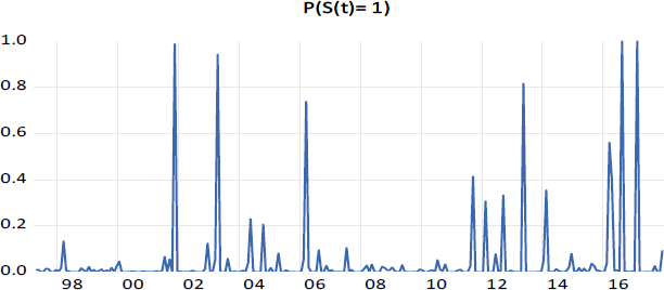 No que se refere à possibilidade de ocorrência de um regime recessivo10, a estimação da abordagem não linear apresenta a probabilidade apresentada pela Figura 1: