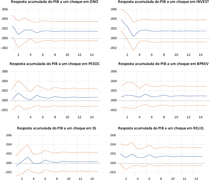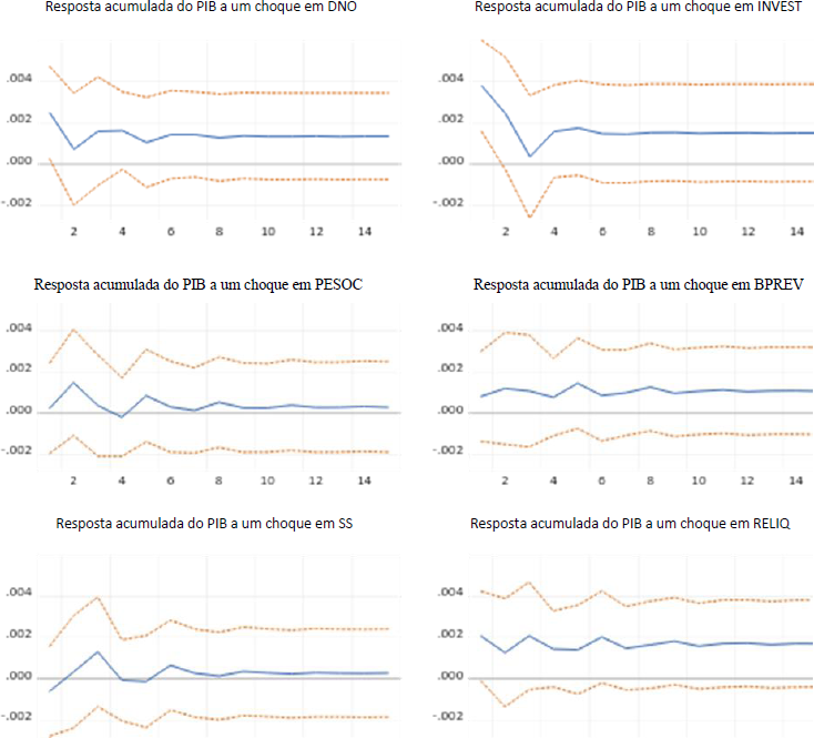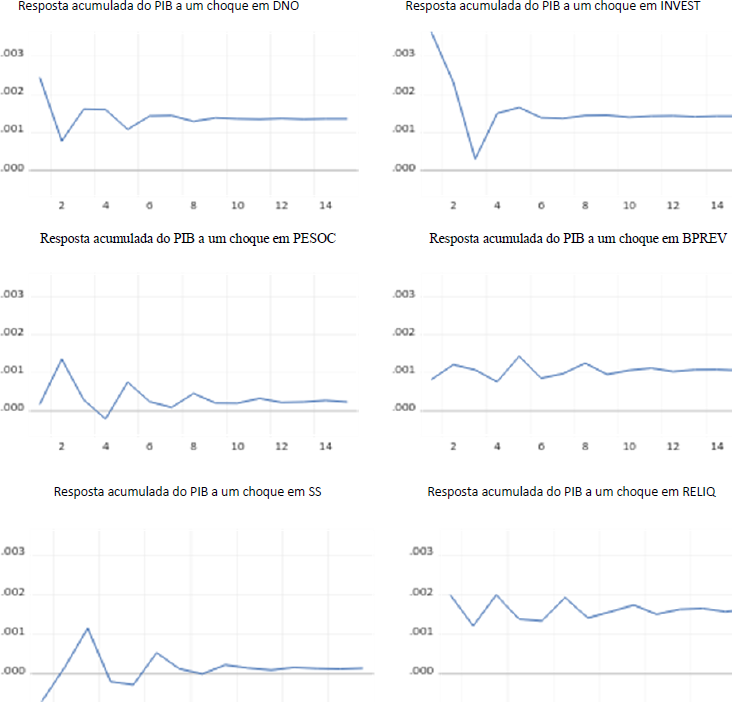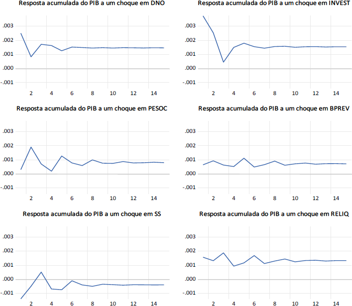 Para o modelo linear (SVAR), o crescimento do PIB ao longo de 15 meses é influenciado por 85,8% de sua própria variância, 6,1% do investimento público, 3,1% das despesas não obrigatórias, 1,2% dos gastos com pessoal e social, 0,5% dos benefícios previdenciários, 1,3% dos subsídios e subvenções e por 1,8% da receita líquida. Os valores também são obtidos para o modelo não linear (MS-VAR): crescimento do PIB ao longo de 15 meses é influenciado por 86% de sua própria variância, 6% do investimento público, 2,8% das despesas não obrigatórias, 1,7% dos gastos com pessoal e social, 0,4% dos benefícios previdenciários, 1,6% dos subsídios e subvenções e por 1,2% da receita líquida.