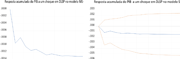 Em relação às funções de resposta ao impulso, as Figuras 4 e 5 apresentam o conjunto de respostas acumuladas dos modelos SVAR e MS-VAR, respectivamente. Além disso, a figura 6 mostra a resposta acumulada da DLSP em relação ao PIB para os modelos lineares e não lineares.