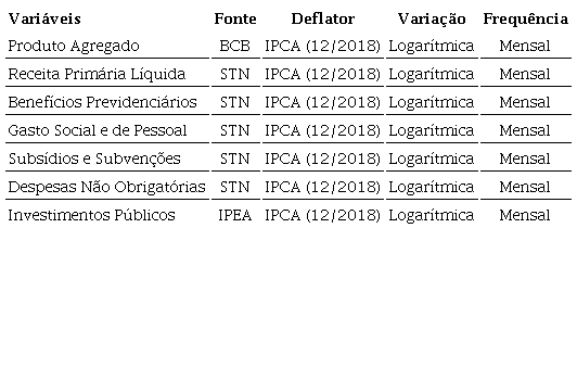 A base de dados constitui-se de observações mensais medidas pelo critério “acima da linha” para o período de janeiro de 1997 a dezembro de 2018. A opção pela frequência mensal em detrimento das periodicidades anual ou trimestral se justifica pelos seguintes motivos: os dados anuais não permitem a verificação da capacidade reativa dos agentes econômicos às mudanças nos gastos do governo ou nos impostos; ainda que os dados trimestrais consigam captar as mudanças súbitas na política fiscal discricionária, estes não são capazes de incorporar a volatilidade das alterações do estado da economia brasileira; os dados mensais apresentam um número elevado de observações em comparação com as amostras anuais e trimestrais.