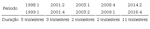 Segundo o Comitê de Datação de Ciclos Econômicos da Fundação Getúlio Vargas (Codace-FGV), durante o período 1997-2018, a economia brasileira passou por cinco recessões. Uma recessão é definida pela variação negativa de dois trimestres consecutivos do nível de atividade econômica. O Quadro 2 mostra o período e a duração em trimestres (T) das recessões: