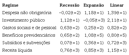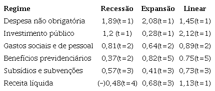 Os choques da despesa não obrigatória em relação ao produto apresentam multiplicadores fiscais elevados e funções de impulso-resposta semelhantes nos dois modelos. Tais semelhanças são consolidadas pela igualdade entre os multiplicadores de impacto e de pico em todos os regimes. Entretanto, os multiplicadores são maiores nos momentos de expansão comparativamente às fases recessivas, em especial no longo prazo, haja vista que o multiplicador cumulativo é de 4,61 na expansão e de 1,98 na recessão.