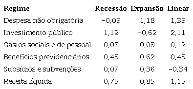 Ademais, conclui-se que a mudança na composição da política fiscal no período 2011-2014 foi ineficaz do ponto de vista dos efeitos positivos sobre o produto agregado. O multiplicador fiscal de impacto do investimento público é o mais elevado no modelo linear e se torna mais expressivo na fase recessiva que na expansiva, logo, se trata da variável mais adequada para a realização de uma política fiscal anticíclica, pois os subsídios e desonerações apresentam impactos reduzidos ou, até mesmo, negativos.