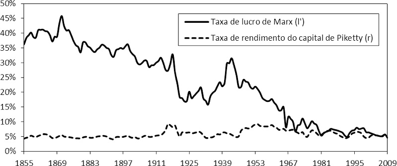 Com uma interessante abordagem provocativa, Esteban Maito (2014) focou-se exclusivamente na crítica à tendência decrescente da taxa de lucro. Em seu artigo intitulado “Piketty versus Piketty”, Maito questiona a inadequação de se aplicar um conceito de “capital” distinto ao de Marx para avaliar sua teoria. Trabalhando com os dados que o próprio Piketty apresenta para os casos da Alemanha e do Reino Unido – uma vez que são os únicos que cobrem um período de longo prazo com um nível de desagregação adequado –, mas ajustando-os para expressarem adequadamente as categorias adotadas por Marx, Maito conclui que eles confirmam empiricamente a existência de uma tendência decrescente da taxa de lucro no longo prazo.