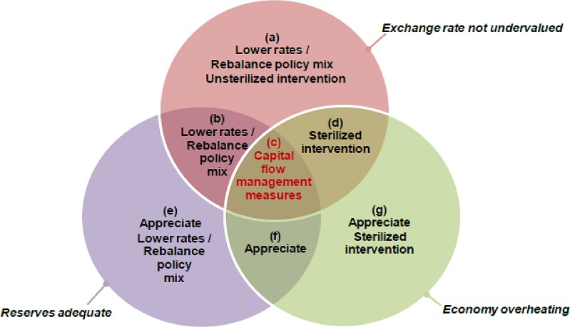 IMF (2011a) is possibly the first study to show this change in standpoint. According to its institutional view, the use of capital controls and macroprudential policies – capital flow management measures (CFMs) – is only justified after the following scenarios (given strong capital inflows): i) when exchange rate appreciation has exceeded its equilibrium level; ii) when the accumulation of international reserves has reached its superior limit; and iii) when the implementation of contractionary fiscal policy and expansionist monetary policy has undergone exhaustion, following product gap estimations concerning interest rates and inflation. This set of prerequisites to implement CFMs has been synthesized in a Venn diagram, such as that in Figure 115.