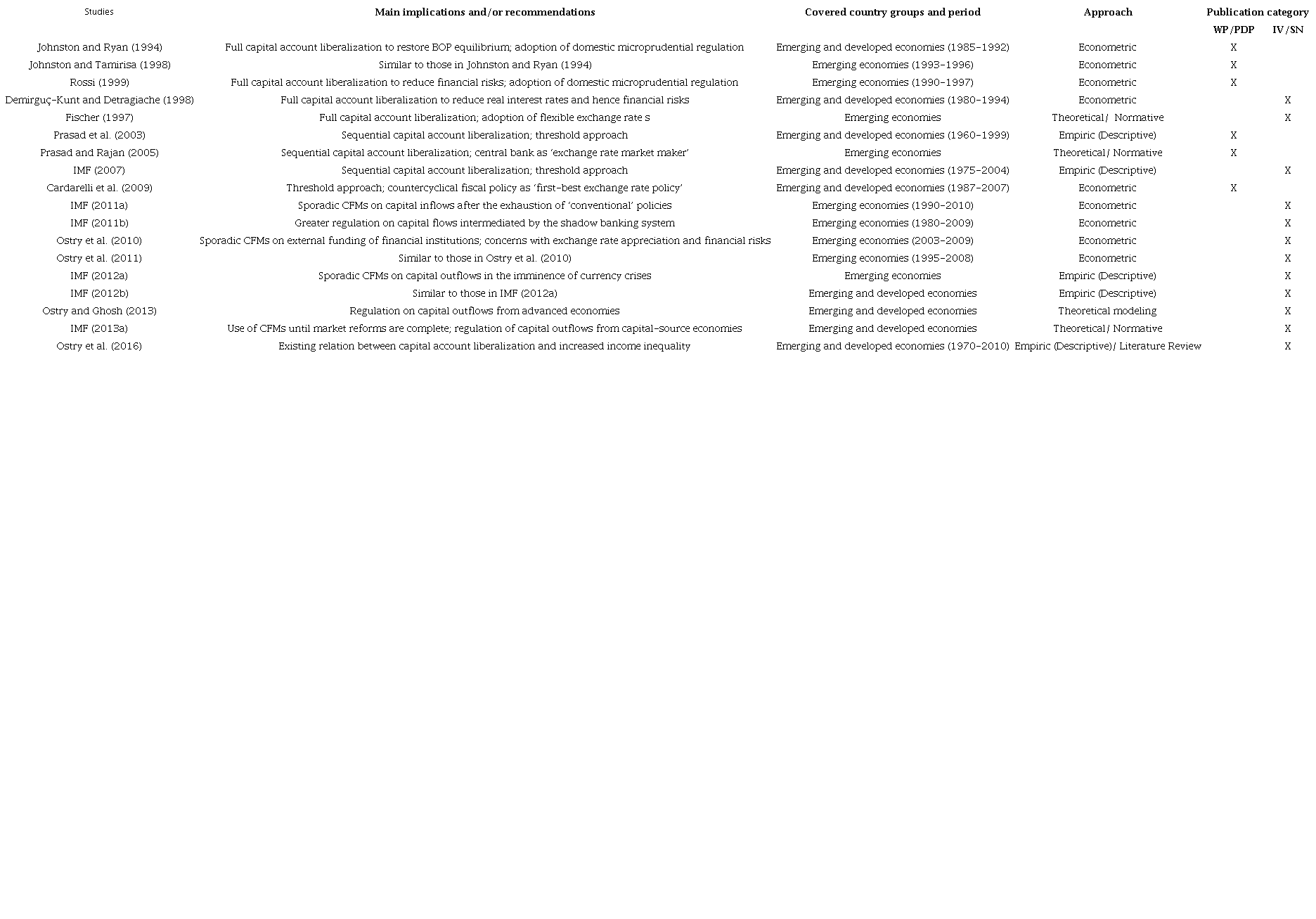 Briefly, we can subdivide the studies IMF published during a broader period into two steps or waves. The first wave disseminated studies that analyzed the structural determinants of capital controls which were still in force in the years before capital account liberalization. They analyzed the effectiveness of several controls and defended financial openness for developing countries. Other studies included in this first step took place during and after the crises in emerging economies. They investigated the causes of these crises and continued to defend capital account liberalization for emerging countries. The second wave of IMF studies took place between the crises of emerging economies and the 2007-2008 GFC. They offered a different approach on capital account liberalization, emphasizing sequencing of capital account liberalization and threshold methodologies.