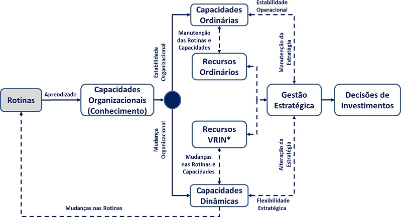 Conforme ilustrado na Figura 2, o trabalho parte do princípio de que as rotinas representam os elos entre as capacidades organizacionais, o uso dos recursos, as questões estratégicas e as decisões de investimento. A manutenção e alteração destes elos proporcionam, respectivamente, estabilidade e mudanças organizacionais. Assim, as rotinas desempenham o papel de manter a estabilidade dos processos organizacionais e nas intenções de investimento. Aliadas à Teoria das Capacidades Dinâmicas, conforme será visto adiante, as rotinas podem ser consideradas como repositórios de conhecimento que abastecem a memória organizacional, podendo ser vistas em grande parte como os “blocos de construção” das capacidades organizacionais. Assim, as Rotinas Operacionais regem as capacidades ordinárias, oferecendo regularidades na operação, na administração e na governança da firma, e as Rotinas de Aprendizado regem as capacidades dinâmicas, oferecendo novas percepções (variação), aproveitamento (seleção) e transformação (retenção). Maiores detalhes podem ser vistos em Gandra (2019; 2022) e Gandra e Pinto Junior (2021).