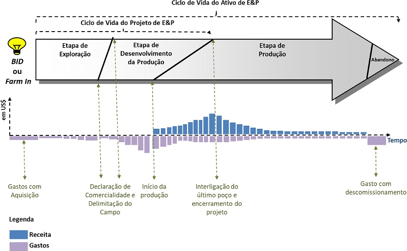 Nas etapas de Exploração e DP, as empresas operadoras investem capitais e recursos para obter e processar informações a fim de encontrar hidrocarbonetos, avaliar e delimitar seus volumes e desenvolver os ativos de produção. Já na etapa de Produção, ocorre a geração de receitas com a extração e comercialização desses hidrocarbonetos.