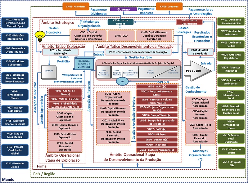 Tático, tanto para exploração, quanto para desenvolvimento da produção, no qual estão os gestores intermediários que supervisionam os trabalhos técnicos, fazem a gestão do Capital Organizacional para o Modelo de Gestão de Projetos de Capital (CO04), representando as capacidades ou o conhecimento que regem os processos necessários para gerir a carteira de projetos de investimento e de ativos em produção. Assim, por simplificação do modelo, os mesmos gestores realizam a Gestão do Portfólio de Exploração (PE01), do Portfólio de Desenvolvimento da Produção (PD01) e do Portfólio de Produção (PP01). O PP01 não foi modelado, pois o foco aqui está nas decisões de investimento em projetos de capital e não nas atividades de produção.