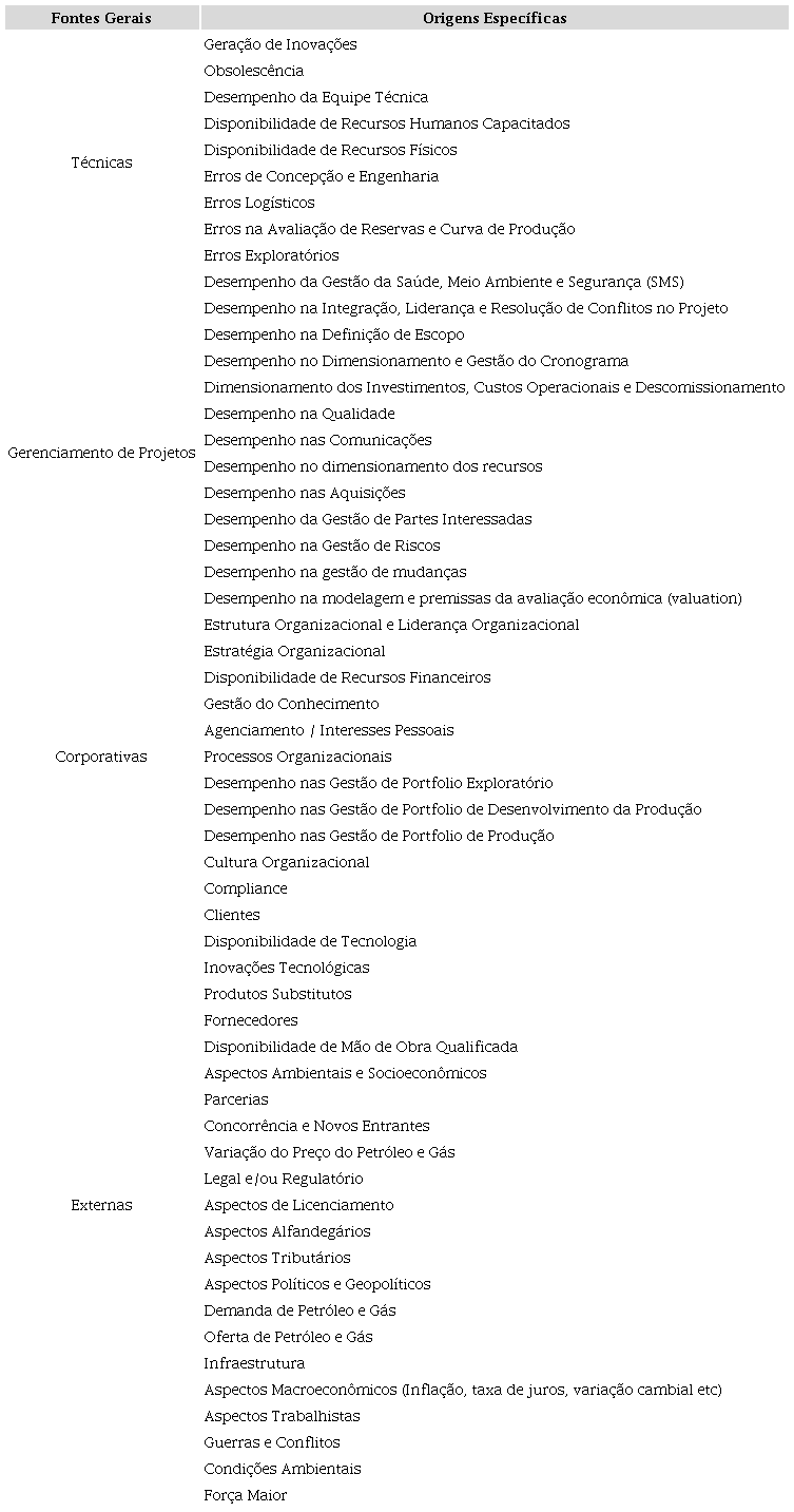 Veiga e Silva (2020) apresentam uma revisão sistemática da literatura sobre as fontes dos riscos no gerenciamento de projetos. Seguindo a mesma lógica, o Quadro 3 apresenta um exemplo prático de estrutura analítica de riscos comumente customizada por empresas para mapear as principais fontes dos riscos em projetos de capital no E&P.