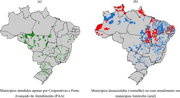 De acordo com os dados do Fundo Garantidor do Cooperativismo de Crédito (FGCoop) (2020), as cooperativas de crédito mostram-se relevantes na inclusão da população menos favorecida, especialmente em cidades com menos de 10 mil habitantes. Conforme destacado no mapa abaixo (Figura 1a), em 2019, 594 municípios eram atendidos apenas por cooperativas de crédito e/ou postos de atendimento avançado, enquanto outras centenas de municípios se encontravam desassistidos de serviços dentro de seus próprios limites geográficos (Figura 1b).