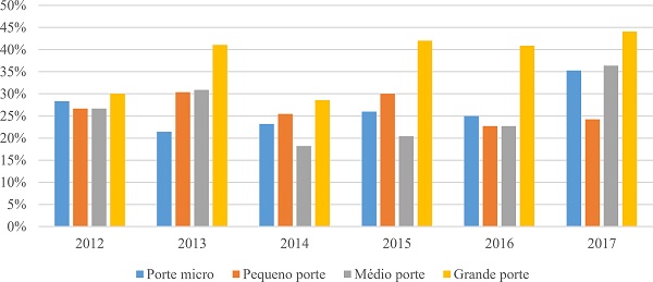 Dentre a distribuição das cooperativas socialmente eficientes, observa-se que as cooperativas de grande porte foram significativamente mais socialmente eficientes que as demais, podendo ser um indicativo de convergência com o esperado na hipótese (b), ainda que outros elementos ainda devam ser analisados adiante. Destaca-se, ainda, que o incremento na eficiência geral em 2017, expresso na Tabela 3, se deu, aparentemente, pelo ganho de eficiência das cooperativas de micro e médio porte (Figura 2).