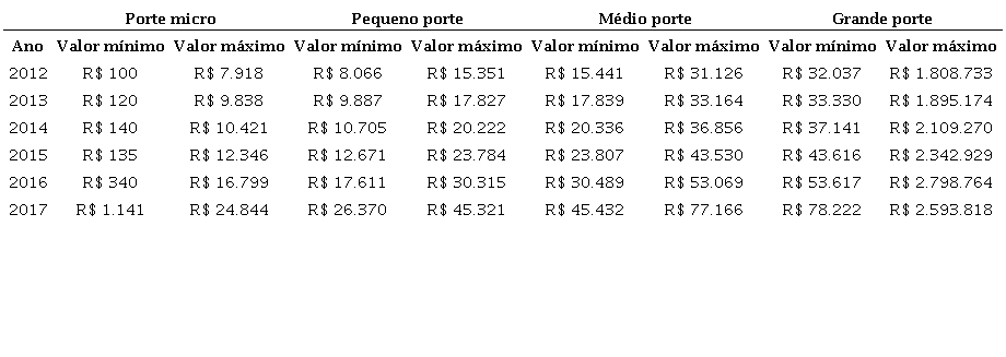 Posteriormente, realizou-se a classificação das cooperativas de crédito rural por porte/tamanho de atuação. Neste caso, utilizou-se a técnica adotada por Branco (2016) e Branco et al. (2017), separando as cooperativas de crédito em quartis a partir do critério o Input X3 (ativo total), no caso, a variável que apresentou maior desvio padrão em todas as amostras. Os valores particionados para cada ano são apresentados na Tabela 1, sendo o primeiro quartil associado às cooperativas de crédito rural de porte micro, o segundo às de pequeno porte, o terceiro às de porte médio e o último quartil às de grande porte.