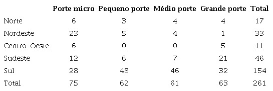 Com relação à distribuição regional das cooperativas eficientes socialmente, é notável a predominância de instituições nas regiões Sul e Sudeste, se comparadas às demais, sendo as do Nordeste predominantemente de porte micro, enquanto as do Sul de pequeno, médio e grande porte (Tabela 4).
