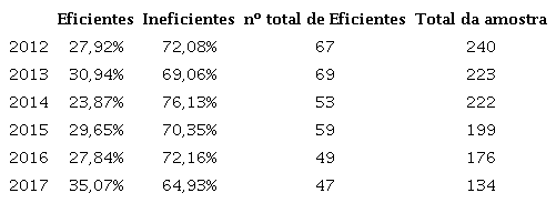 A partir do cálculo do modelo DEA, o primeiro retrato geral observado é que o número de cooperativas de crédito rural eficientes é inferior ao número de instituições não ineficientes, variando de 23% a 30% entre 2012 a 2016, e saltando para 35% em 2017, último ano da amostra (Tabela 3).