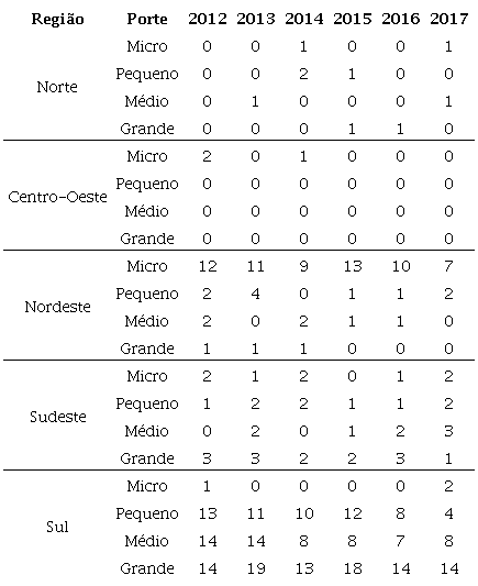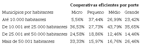 Com base no tamanho populacional dos municípios sede, nota-se que há um padrão variável, a depender do porte das cooperativas. Por exemplo, dentre as de porte micro, a parcela menos expressiva se dá nos municípios com menos de 10 mil habitantes. Porém, na faixa posterior (de 10 mil a 25 mil), tem-se a parcela mais relevante dentre as cooperativas eficientes. Já dentre as grandes, há uma distribuição mais harmônica das cooperativas eficientes entre os tamanhos dos municípios. O único padrão identificável foi que, para todos os portes, a eficiência foi mais predominante nos municípios com população entre 10 mil a 25 mil. Porém, este percentual não é tão diferente das demais faixas populacionais, não podendo se inferir que há uma relação de causa e efeito aqui que deva ser ressaltada. Os resultados em questão estão expressos a seguir, na Tabela 5.
