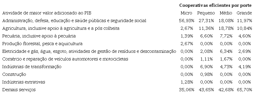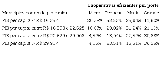 Ao se avaliar a localização das cooperativas mais eficientes, nota-se que as de porte micro se situam em municípios de renda mais baixa e em que a atividade predominante nos PIBs municipais sejam relacionadas à administração pública, o que sugere o importante papel social destas instituições nestas regiões, a despeito de seus tamanhos. Já as cooperativas eficientes de médio e grande porte predominam em municípios com maior nível de renda e em que as atividades agropecuárias e correlatas apresentam maior participação nos produtos municipais.