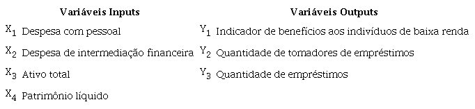 Seguindo este critério, observou-se que as variáveis de input que apresentaram os maiores graus de associação linear com as variáveis de output foram o indicador de benefícios aos indivíduos de baixa renda, a quantidade de tomadores de empréstimos e quantidade de empréstimos5. A síntese das variáveis está expressa no Quadro 1, a seguir.