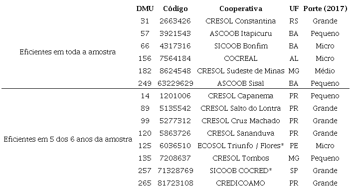Nota-se que as cooperativas da região Sul mais eficientes ao longo do tempo são todas de porte grande, predominando no estado do Paraná, enquanto no Nordeste de porte micro ou pequeno, com destaque para o estado da Bahia.