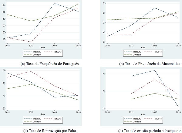 Com relação à hipótese de tendências paralelas, ela é apenas verificável para as escolas cuja participação no programa se deu em 2013 (uma vez que a base de dados se inicia em 2011). De acordo com a Figura 1, nota-se que, para todas as variáveis de interesse, a evolução dos anos de 2011 e 2012 das médias dos alunos das escolas tratadas a partir de 2013 e não tratadas é visualmente paralela, embora as variáveis médias para os alunos do grupo de controle sejam melhores do que as variáveis médias para as escolas tratadas a partir de 2013 (evasão e reprovação por falta são menores, em média, no grupo de controle, assim como as taxas de frequência são maiores, em média, para os alunos desse grupo). Verifica-se, portanto, que o critério de vulnerabilidade utilizado para a escolha dessas escolas pode ser observado nos dados.