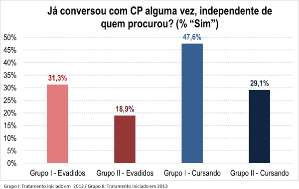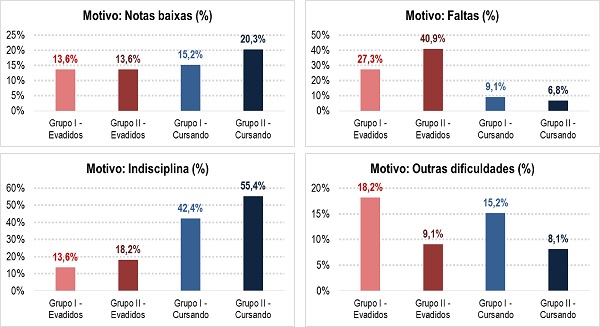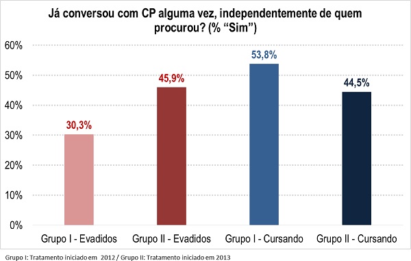 Para entender o motivo dos atendimentos, foi realizada uma pesquisa de campo pelo Ibope com os pais e alunos em 2015. A pesquisa incluiu 901 alunos cursando o fundamental II (8º e 9º ano) e ensino médio (1º e 2º ano) e 99 alunos evadidos entre 2014 e 2015 e indicou que os principais motivos pelos quais os alunos respondentes conversaram com o coordenador de pais foram indisciplina e notas baixas. No caso dos alunos respondentes que evadiram da escola, os motivos mais frequentes foram as faltas e indisciplina. Para mais detalhes ver Apêndice A.