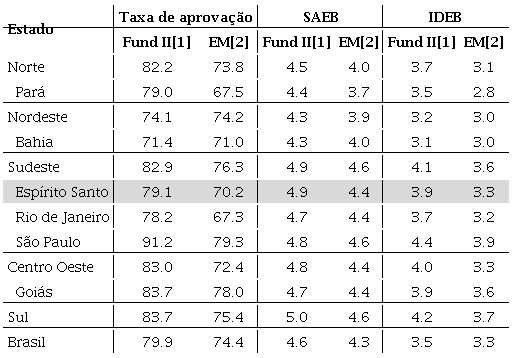 Em 2011, ano anterior à implementação do programa CP, as escolas públicas do Espírito Santo apresentavam o 2º pior Índice de Desenvolvimento da Educação Básica (Ideb) (3,3) entre os estados do Sudeste (estando à frente apenas do estado do Rio de Janeiro, que tem 3,2) e o 9º pior desempenho entre todos os estados brasileiros, considerando os resultados médios para o ensino médio. Na Tabela 1 pode-se verificar os resultados médios de Ideb, Sistema de Avaliação da Educação Básica (Saeb) e taxa de aprovação para o fundamental II e ensino médio, para os estados em que o Programa CP foi implementado. Verifica-se que a taxa de aprovação média para o fundamental II (79,1%) e ensino médio (70,2%) no Espírito Santo encontra-se abaixo da média para o Brasil. Em relação a Saeb, a média para o ensino fundamental II iguala-se à da região sudeste (4,9), porém para o ensino médio (4,4) está um abaixo da média da região (4,6).