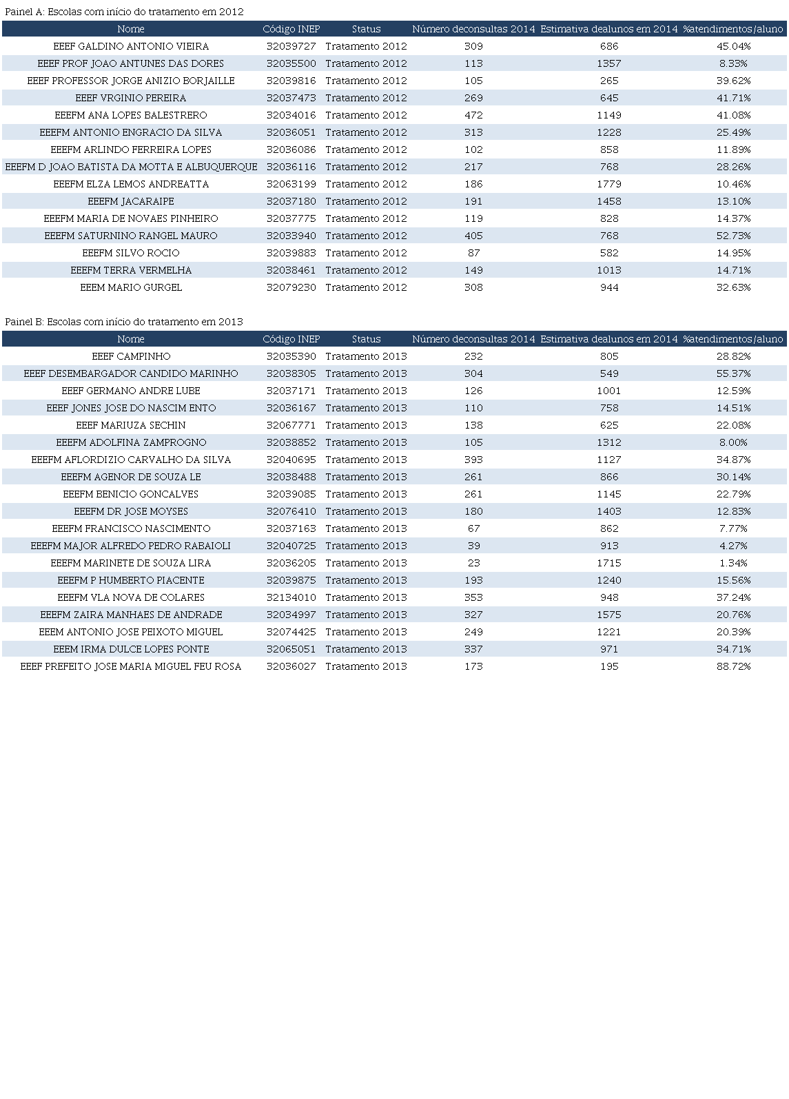 Analisando-se os dados da Tabela 2, observa-se que o número de atendimentos nas escolas que estavam há mais tempo no programa (Painel A) foi 9,3% superior (223 atendimentos por escola, em média) ao número de atendimentos nas escolas que ingressaram no ano seguinte (204 atendimentos médios por escola, Painel B). No entanto, há mais variabilidade nos atendimentos das escolas que contaram com mais tempo de programa (desvio padrão de 119 para escolas tratadas a partir de 2012 e 110 para escolas tratadas a partir de 2013). Adicionalmente, há grande assimetria entre os atendimentos das escolas, havendo quatro escolas com menos de 100 atendimentos anuais e dez escolas com mais de 300 atendimentos no ano de 2014. Nas escolas com menor número de atendimentos, três atingiram taxas de atendimento extremamente baixas, entre 1% e 8% do número total de alunos em cada escola. Já entre as escolas com maior número de atendimentos, 3 escolas atingiram taxa de atendimento acima de 50% e uma escola atingiu 89% dos alunos com 173 atendimentos.
