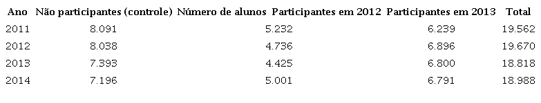 Na Tabela 3 observa-se o número de alunos pertencentes às escolas cujo início do tratamento ocorreu em 2012 e 20139. Observamos, em média, 5 mil alunos que foram expostos ao programa em 2012 e 6,5 mil alunos expostos ao programa em 2013. Os alunos do grupo de controle são cerca de 7,6 mil. A partir do acompanhamento do identificador dos alunos, foi possível, também, identificar aqueles que saíram do sistema educacional do estado, e dessa forma construir uma variável para mensurar a evasão. Estes alunos, por sua vez, podem ter saído do sistema por três principais motivos: i) por terem abandonado ou desistido da escola (evasão); ii) por terem mudado para o sistema privado ou municipal de ensino (transferência interna); e iii) por terem mudado de estado (transferência externa). Considera-se que, no tempo, os motivos ii) e iii) mantenham-se constantes, pois não houve qualquer alteração institucional no período que acarretasse migração de sistemas por parte do aluno. Dessa forma, dada a metodologia de análise utilizada, a variação observada na variável de evasão pode ser atribuída ao motivo i), que é o de interesse desse estudo.
