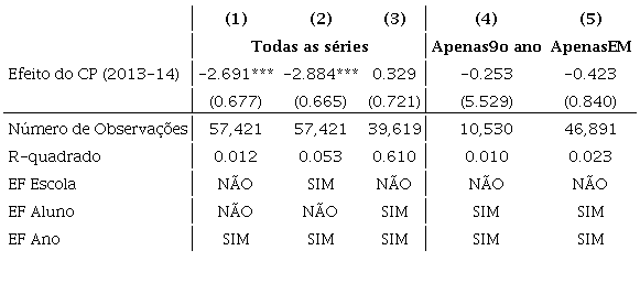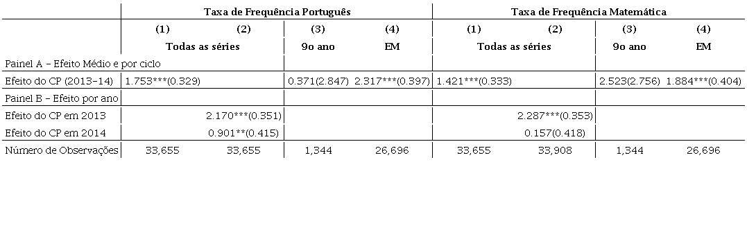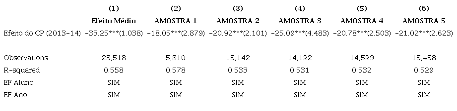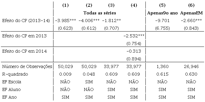O efeito do programa (τ) também foi calculado por ano – ao interagir a variável programaCP com as variáveis binárias (dummy) para os anos posteriores ao tratamento (2013 e 2014, para os alunos de escolas que iniciaram o tratamento em 2012; e 2014, para os alunos de escolas que começaram o programa em 2013. Além disso, os resultados foram separados por ciclo escolar observado na amostra: 9º ano do Ensino Fundamental; e do 1º ao 3º ano do Ensino Médio. Neste último caso, os resultados foram gerados a partir da separação da amostra para alunos destes grupos.