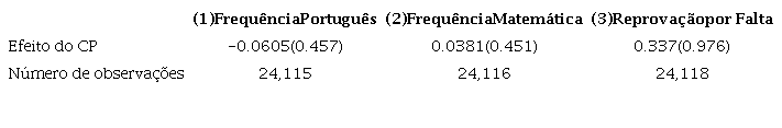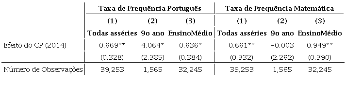 Assim sendo, se ambas as hipóteses de identificação são satisfeitas, tem-se que a diferença observada entre os grupos após o programa é dada exclusivamente pelas ações do programa CP. A partir da estratégia de identificação, é possível verificar se houve convergência dos efeitos estimados, ou seja, se os resultados apontam para a existência de um impacto efetivo do programa CP nas variáveis de resultados dos alunos (y = reprovação por falta, taxa de frequência e taxa de evasão). A equação (1) de benchmark estimada é: