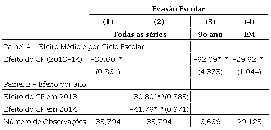 As Tabelas 8 e 9 medem o impacto do programa CP sobre a evasão de alunos. Para medir a evasão escolar, foi construída uma variável que estimasse a evasão dos alunos nas escolas e períodos analisados. Para tanto, a partir dos dados administrativos fornecidos, considerou-se como evadido o aluno que saiu do sistema educacional do estado do Espírito Santo, seja por transferência para o sistema municipal ou privado, seja por mudança de estado, ou por evasão do sistema educacional. Como vimos, considera-se que, no tempo, os dois primeiros motivos se mantenham constantes, pois não houve qualquer alteração institucional no período que acarretasse migração de sistemas por parte do aluno. Nesse sentido, dada a metodologia de análise utilizada, a variação observada na variável de evasão pode ser atribuída ao terceiro motivo, que é o de interesse desse estudo.