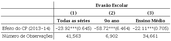 Os resultados fornecem evidências de que o CP reduz a evasão (efeito negativo e significante estatisticamente) para os alunos de escolas cujo programa iniciou em 2012 (redução de 33 p.p. na probabilidade de evasão) e para os alunos das escolas que iniciaram o programa em 2013 (redução de 24 p.p. na probabilidade de evasão), Tabelas 10 e 11, respectivamente. Esse efeito parece ser relevante tanto para os alunos do 9º ano do EF, quanto do Ensino Médio (tanto para a 1ª quanto para a 2ª fase) e mais relevante no ano de 2014, para as escolas cujo CP iniciou em 2012. Resultados semelhantes também foram encontrados por Gertler et al (2007) em relação à redução do abandono escolar em áreas rurais do México.