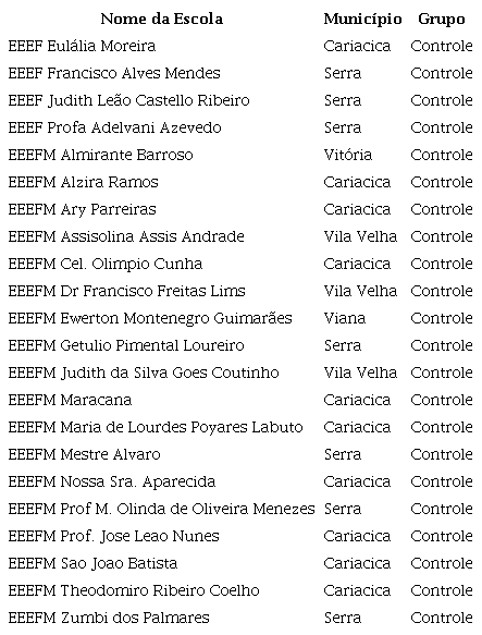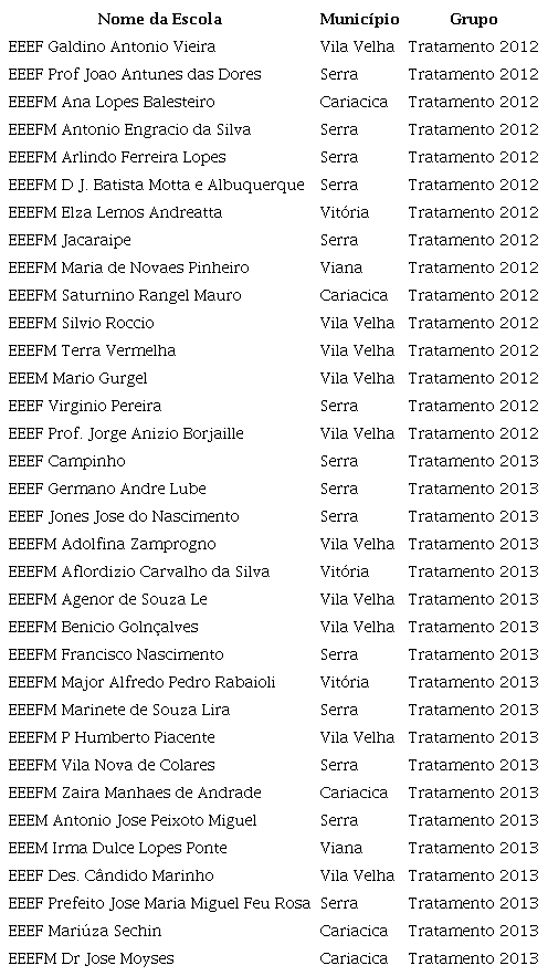 No Espírito Santo, o programa foi implementado em escolas públicas estaduais do ciclo fundamental e médio em cinco cidades selecionadas – Cariacica, Serra, Vitória, Vila Velha e Viana – e contou com duas fases. A 1ª fase ocorreu em 2012, tendo 15 escolas no grupo de tratamento6, e a 2ª fase ocorreu em 2013, com 19 escolas no grupo de tratamento. Além disso, o desenho do programa especificou 22 escolas para comporem o grupo de controle, nos mesmos municípios, com base nas características sociodemográficas dos alunos e na proximidade às escolas tratadas. O Quadro 1 relaciona as escolas do grupo de controle e a Quadro 2 apresenta as escolas dos grupos de tratamento iniciados em 2012 e 2013.