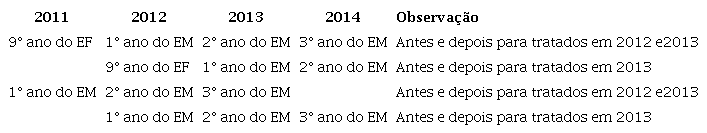 A Secretaria da Educação do Estado do Espirito Santo (SEDU-ES) disponibilizou os dados administrativos de matrículas, frequência e aproveitamento dos alunos dos 5º e 9º anos do Ensino Fundamental e dos 1º, 2º e 3º ano do Ensino Médio de todas as escolas públicas participantes do programa para os anos de 2011 a 20148. A partir dos dados disponibilizados, foi possível construir um painel de alunos, ou seja, conseguimos acompanhar todos os alunos ao longo dos anos. No entanto, dada a janela de dados (2011 a 2014) não foi possível acompanhar os alunos do 5º ano. Dessa forma, foram mantidos na amostra os alunos que estavam no 9º ano do Ensino Fundamental ou no 1º, 2º e 3º anos do Ensino Médio, entre 2011 e 2014 (ver Quadro 3). Adicionalmente, os alunos de escolas tratadas (em 2012 ou 2013) que migraram para escolas do grupo de controle (ou vice-versa) foram eliminados da base de dados utilizada com intuito de eliminar o possível efeito crossover.
