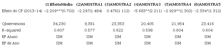 Em que i indexa os alunos contemplados no estudo e t o ano de observação dos dados (2011, 2012, 2013, 2014); ai é o efeito fixo para cada aluno i; δt é o efeito fixo no ano; programaCPit é uma variável binária que identifica os alunos das escolas que participam do programa após a implementação. Neste caso, o efeito do programa é identificado pelo parâmetro τ. Vale ressaltar que o programa não consegue atingir todos os alunos dentro da escola. Logo, o efeito que se mede é a intenção de tratar (em inglês, intention-to-treat ou ITT). é possível que o efeito medido, portanto, subestime o verdadeiro efeito para aqueles alunos que efetivamente foram impactados pelo programa.