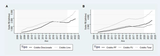 Como se observa na Figura 1.A, o incremento é substancial nos saldos da carteira de crédito livre (aqueles que possuem flexibilidade e gerência das instituições financeiras com relação à definição dos prazos e taxas disponibilizados, dentro da legislação vigente) e crédito direcionado (linhas em que a taxa de juros e a fonte dos recursos são definidos pelo governo) até o período da crise institucional brasileira do biênio 2015/2016.