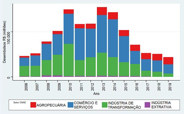 No Brasil, o volume do estoque de crédito do BNDES em comparação ao PIB total no país passa de 25,6% em 2001 para 53,7% em 2015 (BNDES, 2017). A Figura 2 mostra a evolução dos desembolsos de recursos do BNDES por município, agrupados anualmente, entre 2006 e 2019 (excluídos os créditos em que foram disponibilizados para múltiplos locais, onde não pode ser identificado o município onde a empresa atuava). Entre 2006 e 2010 há grande evolução nos desembolsos, chegando ao patamar de em torno de 150 bilhões em valores correntes neste último ano, retraindo-se no biênio 2012-2013 e voltando a crescer no biênio 2014-2015.