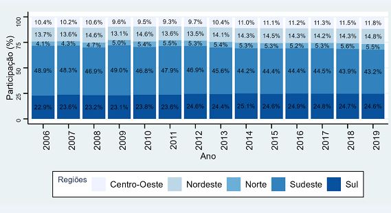 Entender a dinâmica das regiões na disponibilização de recursos financeiros dada a sua participação na produção interna se torna extremamente relevante neste contexto. Em termos de dinamismo regional, historicamente, a região Sudeste tem desempenhado um papel central na economia do país, graças ao seu processo de industrialização proeminente. Isto é observado na Figura 3, que apresenta a distribuição espacial do PIB brasileiro por regiões.