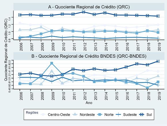 Desta forma, além de se observar diferentes dinâmicas de crédito ao longo das regiões brasileiras, há indícios de desconcentração regional do crédito em detrimento de regiões que historicamente apresentam menor dinamismo econômico. Isto porque a região dinâmica do Sudeste apresenta reduções em seu quociente de crédito no período, tanto em crédito livre como direcionado, passando a demonstrar que em 2019, por exemplo, a sua participação de crédito direcionado do BNDES está abaixo da sua participação relativa do PIB. Outrossim, as regiões Nordeste e Norte chegam ao ano de 2019 com QRC-BNDES superior a 1, após importantes incrementos de crédito direcionado a partir de 2016 para estas regiões.
