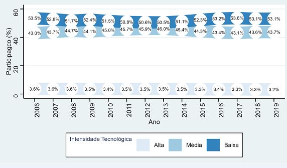 A Figura 5 retoma os resultados acerca da do desempenho histórico da participação total de vínculos industriais no país, em sendo empresas consideradas de Alta, Média e Baixa intensidades tecnológicas – classificações tecnológicas disponibilizadas por Cavalcante (2014) –, com relação ao total de vínculos industriais daquele território, para o período 2006-2019.