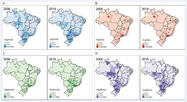 A distribuição espacial do QL dos vínculos de baixa intensidade tecnológica da indústria de transformação (Figura 7.D) possui uma distribuição espacial mais equilibrada no território brasileiro, com pouca alteração entre os períodos, passando de 252 microrregiões em 2006 para 280 em 2019.