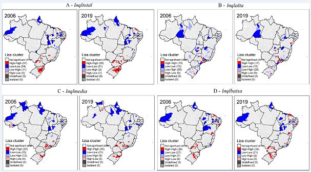 Os valores limites então são definidos para testar a hipótese nula de que os valores são normalmente distribuídos. O indicador LISA mostra então as áreas onde os processos de autocorrelação local (I Local de Moran) são maiores que os processos de autocorrelação global (I Global de Moran) e onde não há autocorrelação (Loonis; Bellefon, 2018). O diagrama de Moran mostra, por outro lado, a existência de quatro grupos ao longo da distribuição dos grupos: o grupo alto-alto (onde altos valores observados são circundados por altos valores nas regiões vizinhas), alto-baixo (onde altos valores observados são circundados por baixos valores nas regiões vizinhas), baixo-alto (baixos valores são circundados por altos valores nas regiões vizinhas) e baixo-baixo (baixos valores são circundados por baixos valores nas regiões vizinhas).