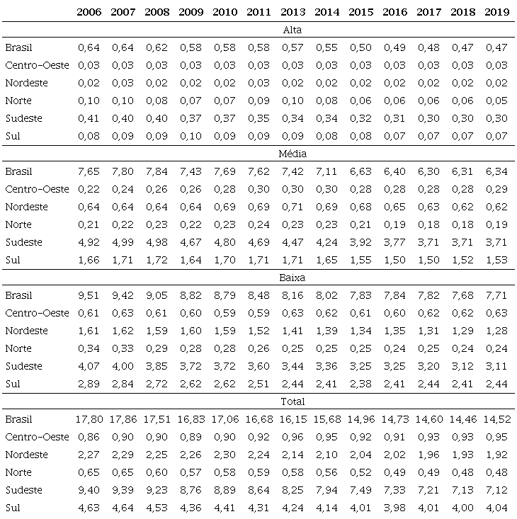 A Tabela 1 apresenta a evolução da participação percentual de cada grupo de vínculos industriais, de Alta, Média e Baixa intensidades tecnológicas, no Brasil e também em cada uma das suas regiões, considerando a sua representação sobre a quantidade de empregos totais de todas as atividades econômicas, para o período de 2006 a 2019. A região Sudeste apresenta grande proporção nestes tipos de vínculos, representando 9,4% de participação de vínculos industriais totais em relação a todos os vínculos do país em 2006, porém, reduzindo para 7,12% em 2019. O Centro-Oeste foi a única região que elevou a participação deste tipo de emprego no período, de 0,86% para 0,95% do total de empregos industriais do país.