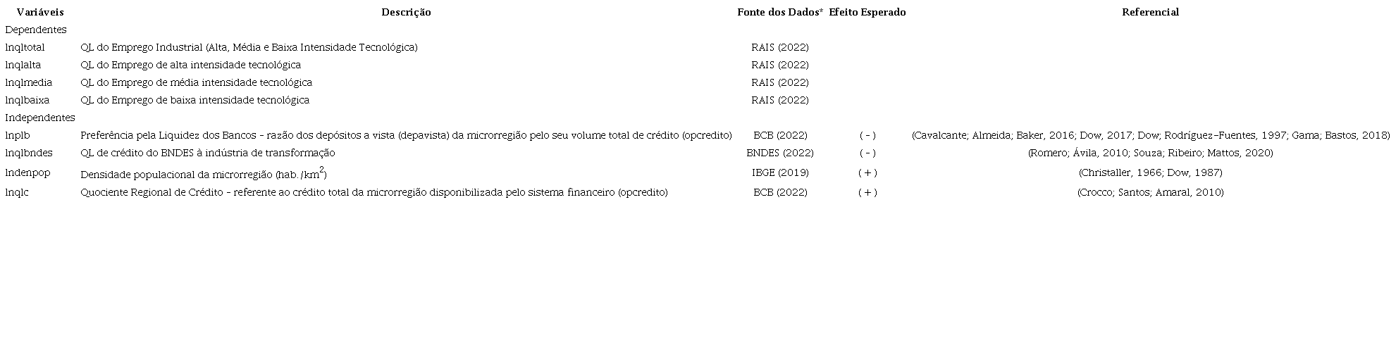Os dados utilizados para a criação das variáveis são: opcredito – valor das operações de crédito por município; depavista – valor dos depósitos à vista nas instituições financeiras por município; totalv – quantidade total de vínculos de emprego na microrregião em todos os setores; tvinc – quantidade total de vínculos de empregos dos segmentos de baixa, média e alta intensidade tecnológica do setor manufatureiro, extraído de RAIS (2022); bndesit – crédito total disponibilizado à indústria de transformação por microrregião; PIB – Produto Interno Bruto da microrregião, extraído de SIDRA (2022).
