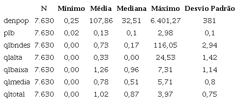 d) wlnqlbndes: logaritmo do QL do valor total do crédito disponibilizado pelo BNDES para a indústria nos vizinhos da microrregião, uma vez que efeitos espaciais podem ter externalidades importantes advindos desta vizinhança sobre a concentração da atividade industrial;