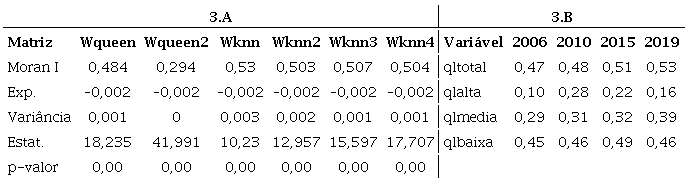 A Tabela 3.B apresenta o Indicador Global de Moran para as variáveis dependentes deste trabalho, para cada um dos anos de 2006, 2010, 2015 e 2019, com a matriz Wknn. Nota-se que a autocorrelação espacial do QL de vínculos (qltotal) elevou-se entre os períodos, passando de 0,47 em 2006 para 0,53 em 2019, ou seja, aumentou a correlação entre o QL industrial da microrregião com o QL industrial de seus vizinhos.